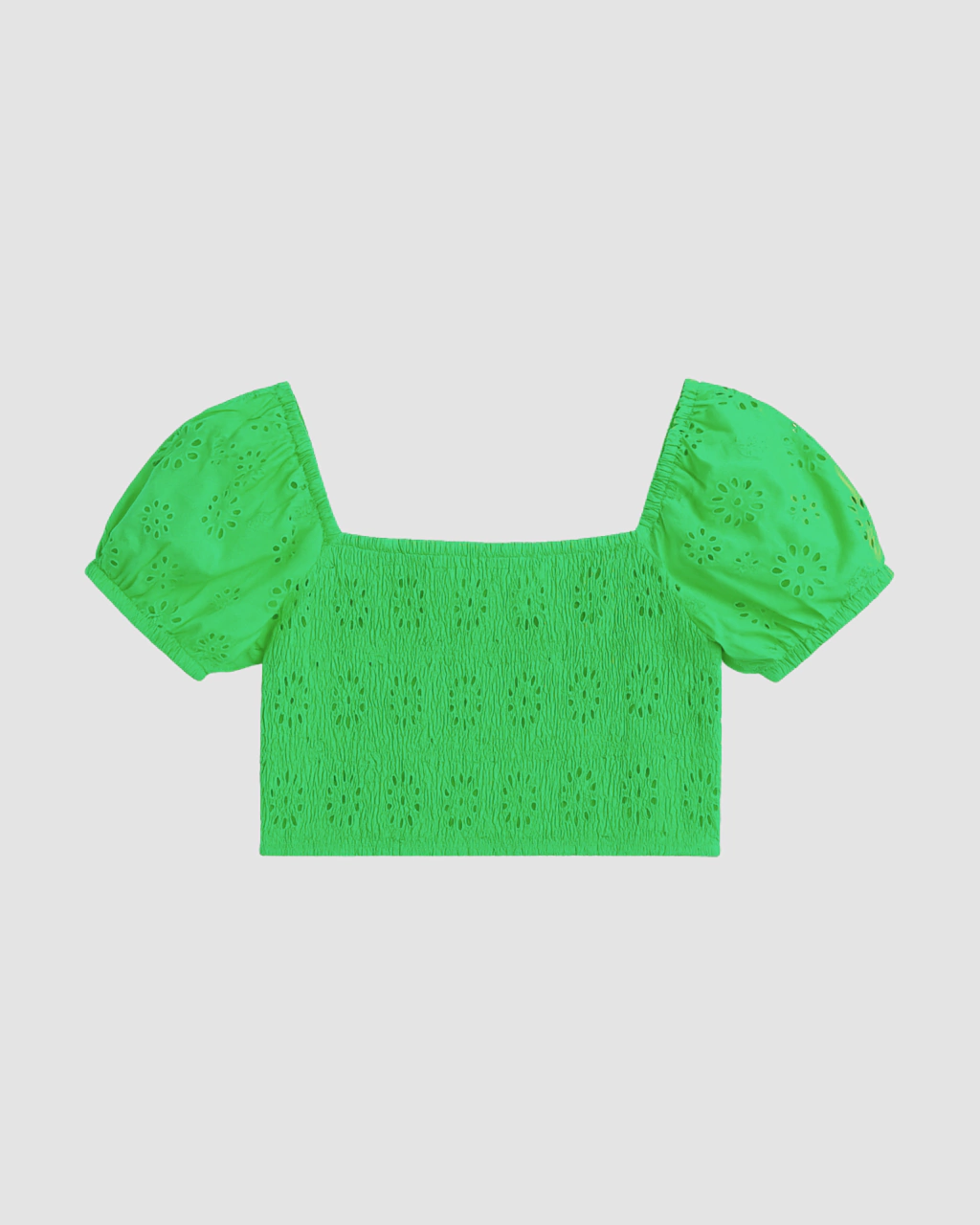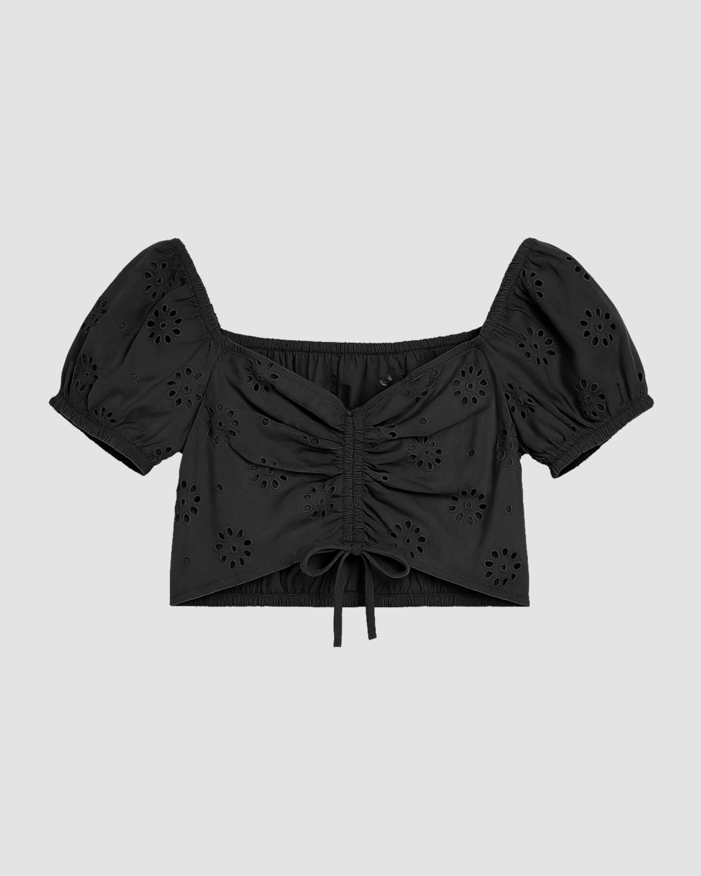 Blusa confeccionada en tejido broderi 100% algodón, con mangas cortas abullonadas y elástico en la parte superior y espalda para un calce cómodo y adaptable.